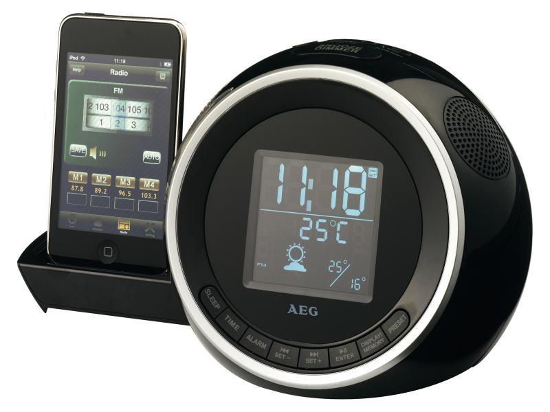 Dock AEG SRC 4438 bude po vložení iPodu nebo iPhonu 3G dobíjet Vaše zařízení, ale můžete jej také využít pro přehrávání hudby, která je v těchto izařízeních uložená. Část docku, do které je na obrázku zasunutý iPhone je vysouvací šuplík. Jakmile nebudete dock potřebovat, zasunete jej a na stole budete mít uhlazený elegantní budík s rádiem. Podle vašeho nastavení nastavení můžete být ráno vzbuzení zvukem rádia, pípáním budíku nebo přehráváním mp3 z iPhonu / iPodu.