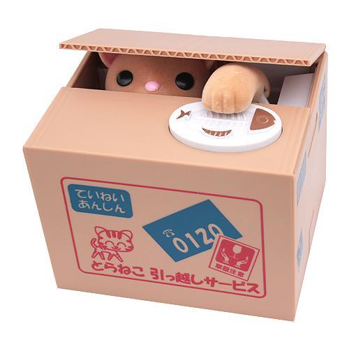 Japonci mají svá specifika a jedním z nich je pravděpodobně menší úcta ke zvířatům. Jinak si nedokážeme vysvětlit, jak je napadlo, že bude vypadat roztomile, když zavřou malou kočičku do krabice a navíc se jí budou snažit vylákat penězi ven. No... posouzení výsledku je na Vás. Jakmile položíte minci na krabičku, kočika schovaná uvnitř zamňouká, pak si otevře víko od krabice a tlapkou schrábne finance. 2 x AA baterie nejsou součástí balení.