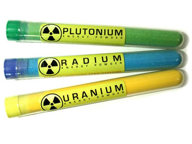 Všichni často během dne potřebujeme trochu nadopovat. Radioaktní prášky jsou skvěle skladné, dávkovatelné a chutné. Modré radium má příchuť malin, žluté uranium citronového dortu a zelené plutonium hrušky. Každá ampule obsahuje 90 mg kofeinu, který zbystří Vaše smysly a navíc zanechá na Vašem jazyku vtipnou stopu. Uvedená cena obsahuje 3 ampule - uranovou, plutoniovou a radiovou.