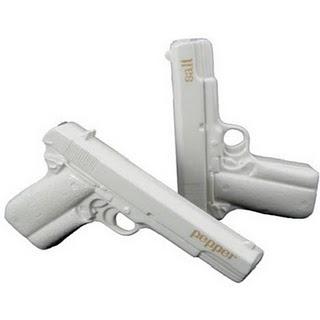 Slánky s nádechem nebezpečí se nám velmi zalíbily. Balení obsahuje 2 keramické slánky v designu pistole M1911, která byla ve výzbroji US Army od 1911 do 1985. Nyní se jimi můžete vyzbrojit i Vy ve Vaší kuchyni. Rozměry jedné pistole jsou 15.5 x 10 cm. Zabaleny jsou v dárkové kazetě. Narozdíl od opravdových pistolí, tyhle můžete věnovat i jako svatební dárek. Otvory, kterými se sůl a pepř sype ven jsou samozřejmě v hlavních obou slánek. Slánky jsou vyrobeny tak, aby bylo možné je postavit i navýšku.