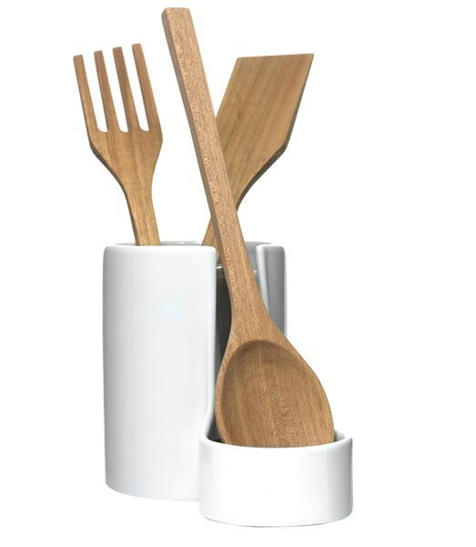 Potřebujete nové kuchyňské nástroje? Pořiďte si je. My vám je nabízíme i s praktickým a vkusným stojanem. Stojan s kuchyňskými nástroji od designové společnosti Sagaform je vyrobený z porcelánu, nerezu, dřeva a jejich výška je 14 cm.