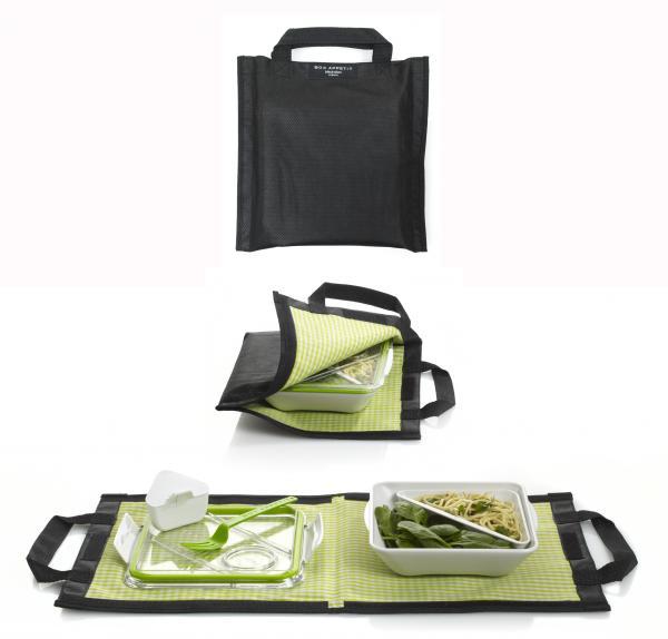 Chcete si sebou vzít svačinu v lunch boxu? Nabízíme vám na něj tašku - černou od designového studia BLACK-BLUM. Tato taštička je na suchý zip a po jejím rozložení slouží jako prostírání. Její rozměry jsou 24x29 cm.