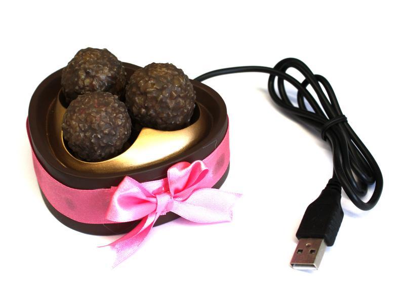 Tři pralinky, které vidíte na obrázku jsou vlastně pouze jen krytkami pro USB konektory. Celkem má tento hub 3 volné konektory pro zapojení dalších zařízení k Vašemu PC. Mašlička na hubu je opravdu skutečná a dotváří dokonalou kamufláž. Šířka hubu je 9 cm a výška 5 cm. Jestli víte, že má Vaše polovička ráda Ferero, tak tyhle bonbony jsou dost podobné.